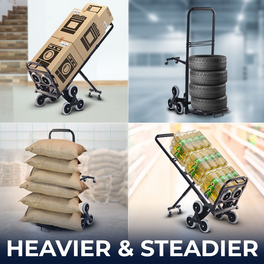 - Stair-climbing wheels: The trolley is typically equipped with wheels fixed with specially designed A-frames that are designed to grip stairs securely and climb up or down steps smoothly, minimizing the need for lifting or carrying heavy loads.