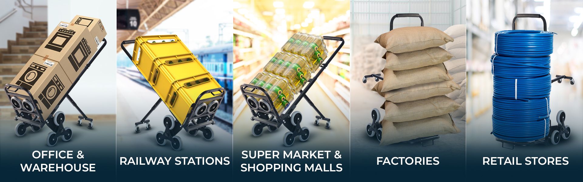 - Inaithiram’s stair climbing trolleys are specialized type of hand truck designed to help users transport heavy loads (upto 150kg) up and down stairs with ease.