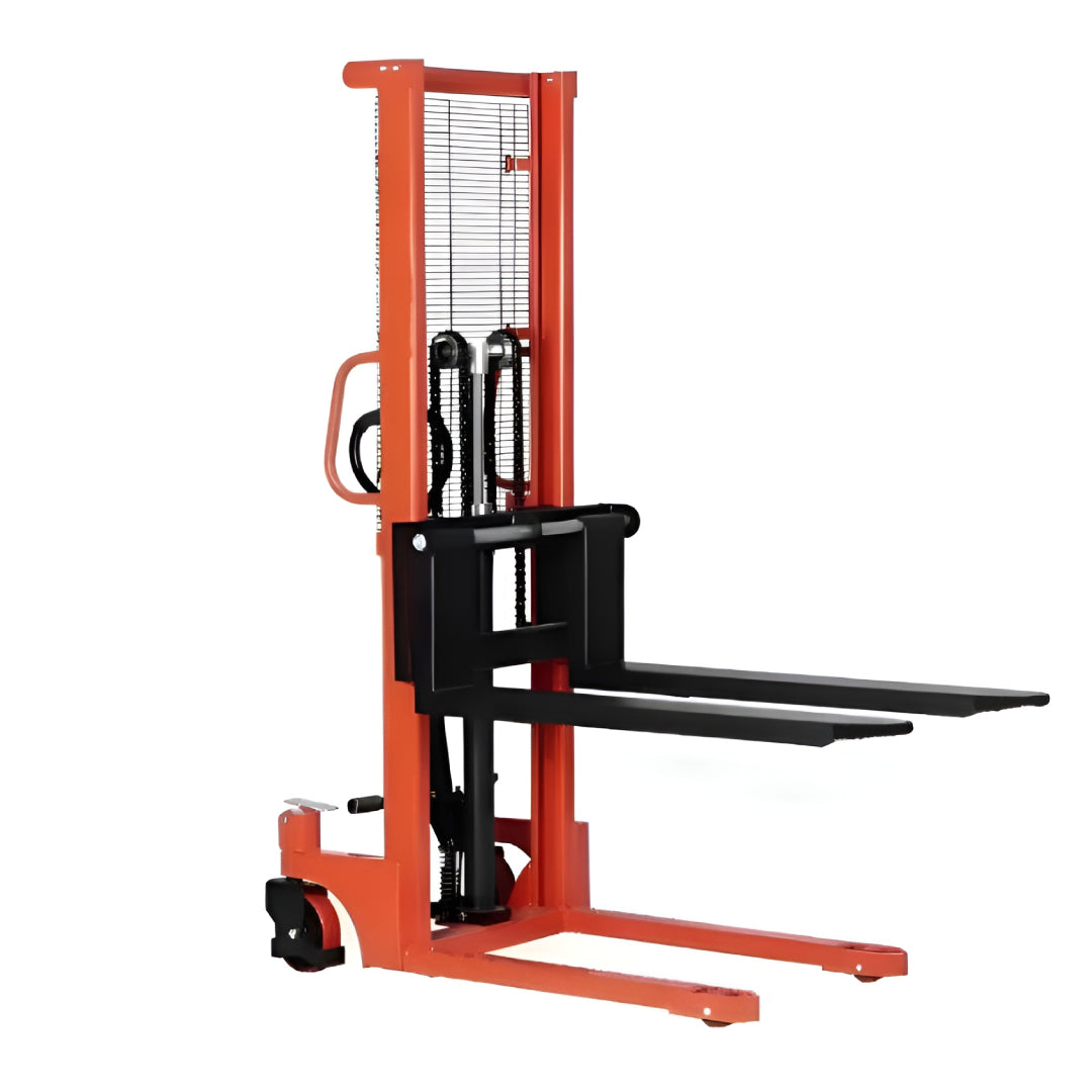 - Built with a strong C-section steel frame, this manual stacker handles loads up to 2000kg (2 tons), providing stability and durability for heavy lifting tasks.